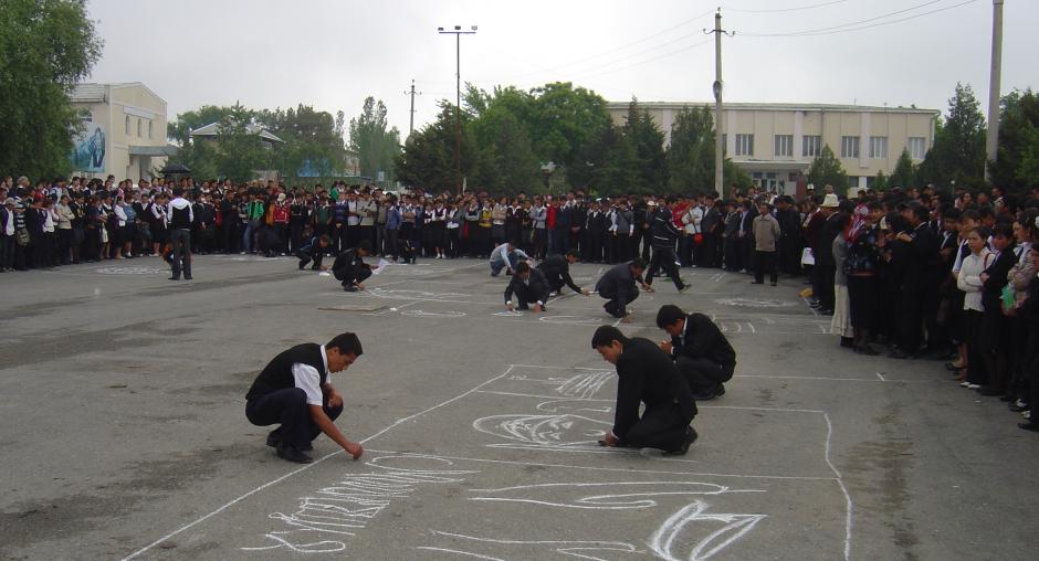 Young people engage in a pavement drawing competition on what should police look like, during the police open day organized by the OSCE centre in Bishkek, Batken City, 20 May 2009 (OSCE/Daniyar Matikanov)