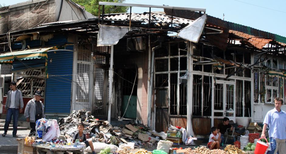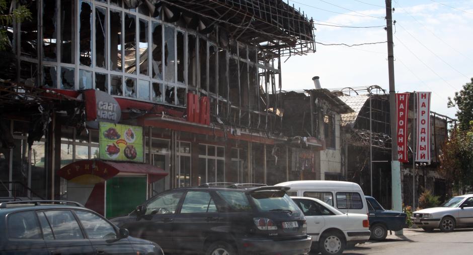 A market stall is set up outside a burnt-out building in Osh, Kyrgyzstan, as people try to rebuild their lives following the violent unrest there in June. (OSCE/Ruslan Izmaylov)