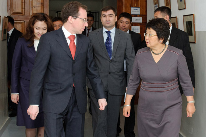President of the Kyrgyz Republic Rosa Otunbaeva (r) visiting the OSCE Academy in Bishkek, accompanied by Maxim Ryabkov (centre-left), the Director of the OSCE Academy and Lilian Darii (c), the Deputy Head of the OSCE Centre in Bishkek, and students and employees of the Academy, Bishkek, 15 April 2011.