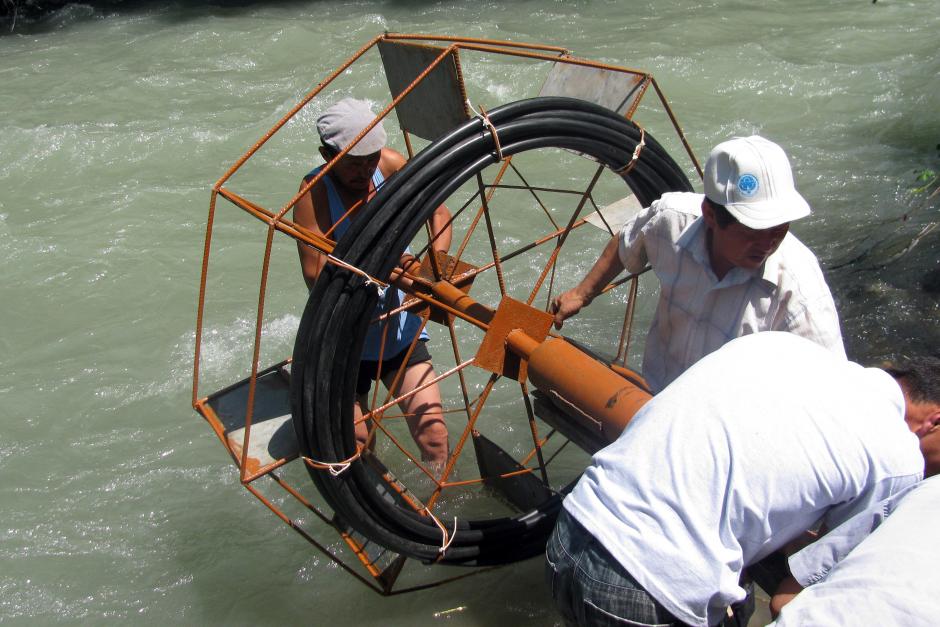 Teachers install a water wheel at Osh State University, Osh, 9 July 2011.
