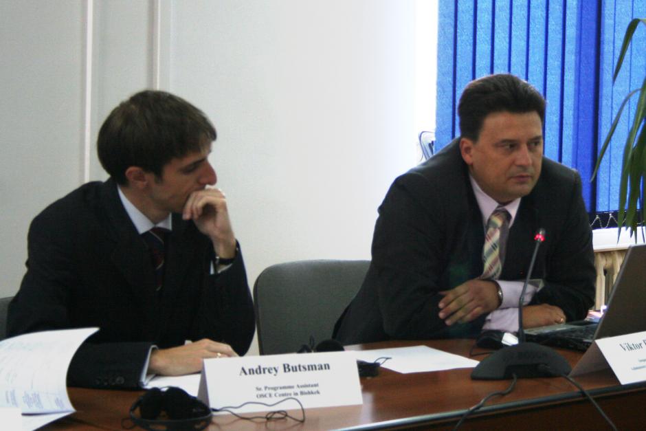 Andrey Butsman, Senior Programme Assistant at the OSCE Centre in Bishkek (left), and Victor Bedash, Inspector of the Crisis Section of the Prime-Minister's Office, at a roundtable discussion on crisis management in Kyrgyzstan, Bishkek, 19 September 2011.