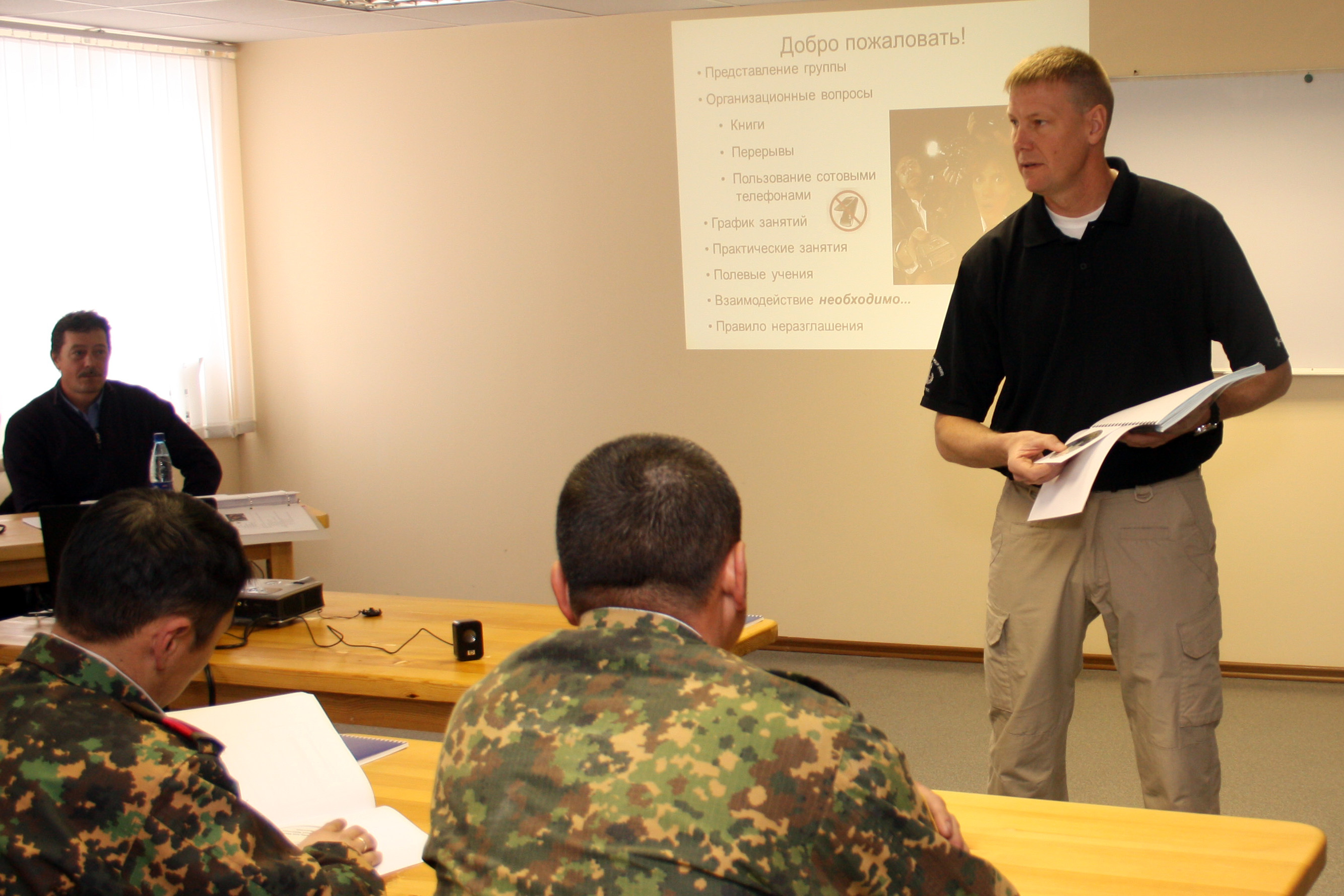 Стивен Питерсен, руководитель группы саперов Оборонного агентства по снижению угроз сухопутных войск США, проводит тренинг по обеспечению безопасности мест хранения обычных боеприпасов и управлению их запасами для сотрудников Министерства оборны Кыргызстана, Кой-Таш, 27 февраля 2012 года.