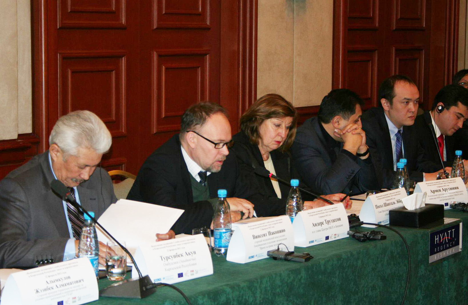 Слева направо: Омбудсмен Турсунбек Акун, исполняющий обязанности главы Центра ОБСЕ в Бишкеке Андерс Трёдссон и глава Представительства ЕС в Кыргызской Республике Посол Шанталь Эбберехт на открытии дискуссии в формате круглого стола, организованного Центром ОБСЕ в Бишкеке, 22 февраля 2012 года.