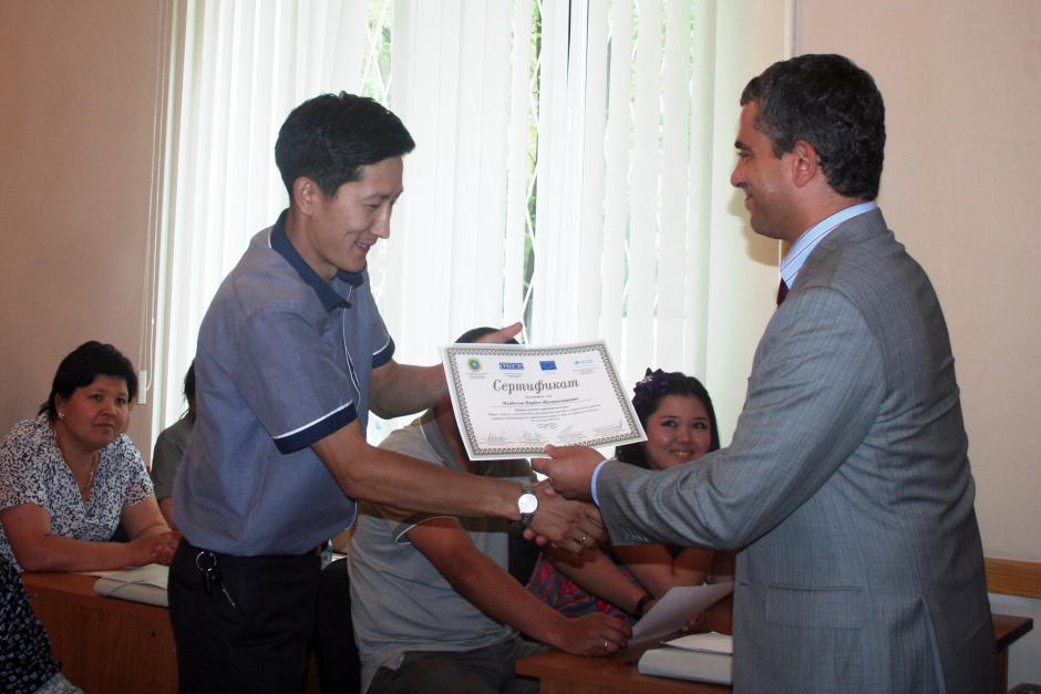 Fabio Piana (r), Senior Human Dimension Officer at the OSCE Centre in Bishkek, hands a certificate to a participant of an OSCE-organized training course on human rights for prosecutors, Bishkek, 23 June 2012.