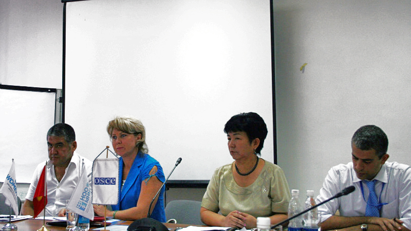 L-r: Deputy Interior Minister Kursan Asanov; Member of Parliament Irina Karamushkina; Deputy Minister of Youth, Labour and Migration Innovat Nimatova, and Senior Human Dimension Officer af the OSCE Centre in Bishkek Fabio Piana, at a seminar on developing a national action plan for the implementation of UN Security Council Resolution 1325 on Women, Peace and Security, Bishkek, 25 July 2012.