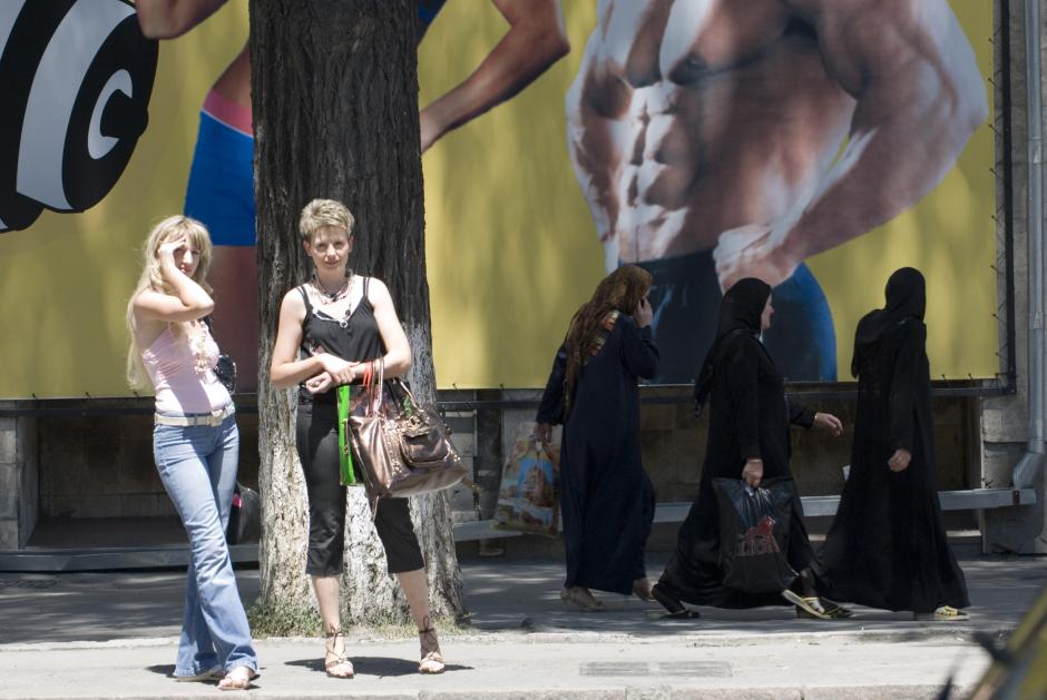 Traditionally and the modern dressed women in the centre of Bishkek, in Kyrgyzstan, June 2008.