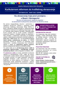 Misija OSCE-a u Bosni i Hercegovini osmislila je, i, u periodu od oktobra 2018. do marta 2022. godine, realizovala projekt „Kurikularnom reformom do kvalitetnog obrazovanja“, koji su finansirale vlade Kraljevine Norveške i Republike Italije. Svrha projekta bila je pružiti podršku nadležnim obrazovnim vlastima u iznalasku rješenja za neophodne i hitne promjene u obrazovanju zasnovane na rezultatima učešća u međunarodnim procjenama učeničkih postignuća (PISA 2018, TIMSS 2019), kao i za prevazilaženje izazova tokom učenja i podučavanja na daljinu za vrijeme pandemije COVID-19, odnosno za postizanje bolje inkluzivnosti i kvaliteta obrazovanja kroz kurikularnu reformu u skladu sa Zajedničkom jezgrom nastavnih planova i programa definisanom na ishodima učenja. Ovaj dokument sadrži kratki pregled rezultata projekta.