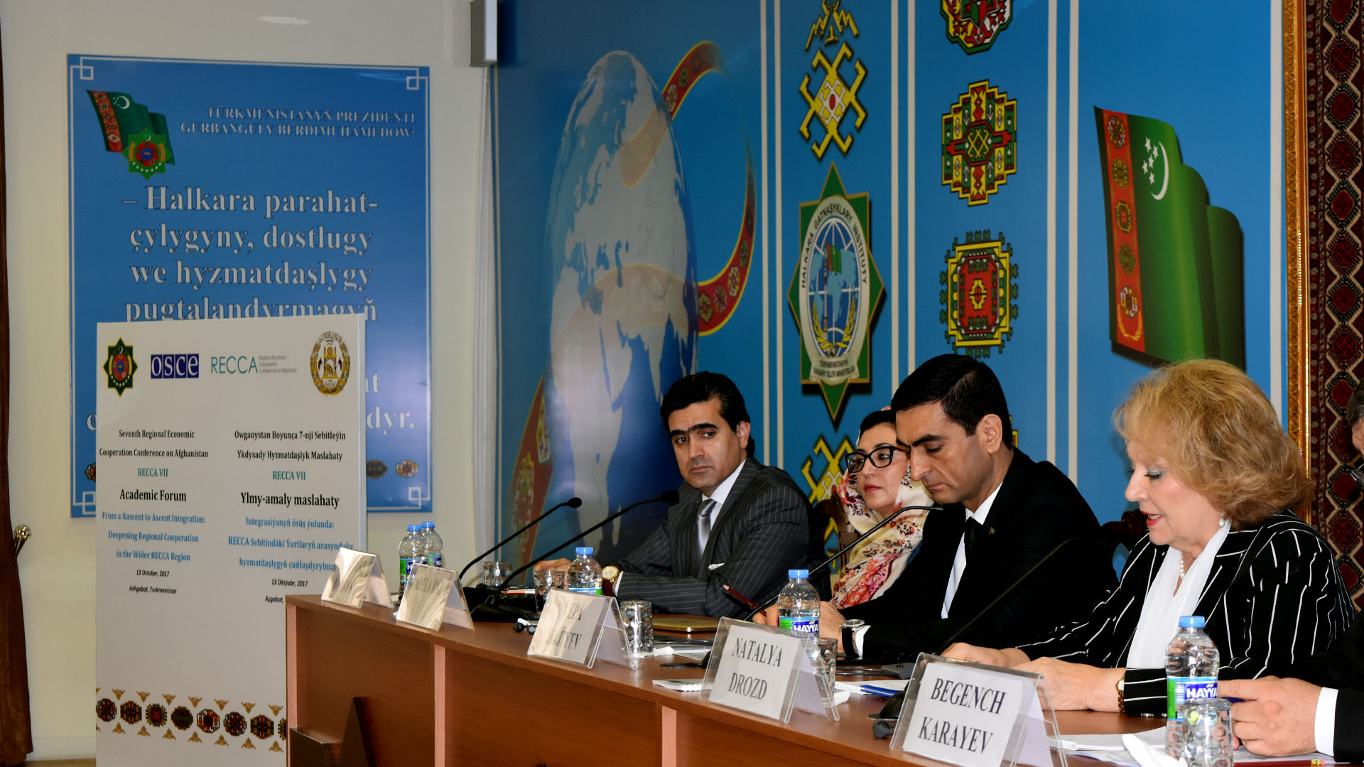 Ambassador Natalya Drozd (right), Head of the OSCE Centre in Ashgabat, makes opening address to the participants of the academic forum, accompanied by Vepa Hadjiyev (centre), Deputy Foreign Minister of Turkmenistan, Adela Raz (centre-left), Deputy Foreign Minister of Afghanistan, Ashgabat, 13 October 2017.