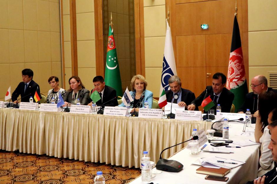 Head of the OSCE Centre in Ashgabat Natalya Drozd (c) addresses participants at the OSCE-organized Turkmen-Afghan workshop on combating illicit trafficking in cultural property, 24 October 2018, Ashgabat.