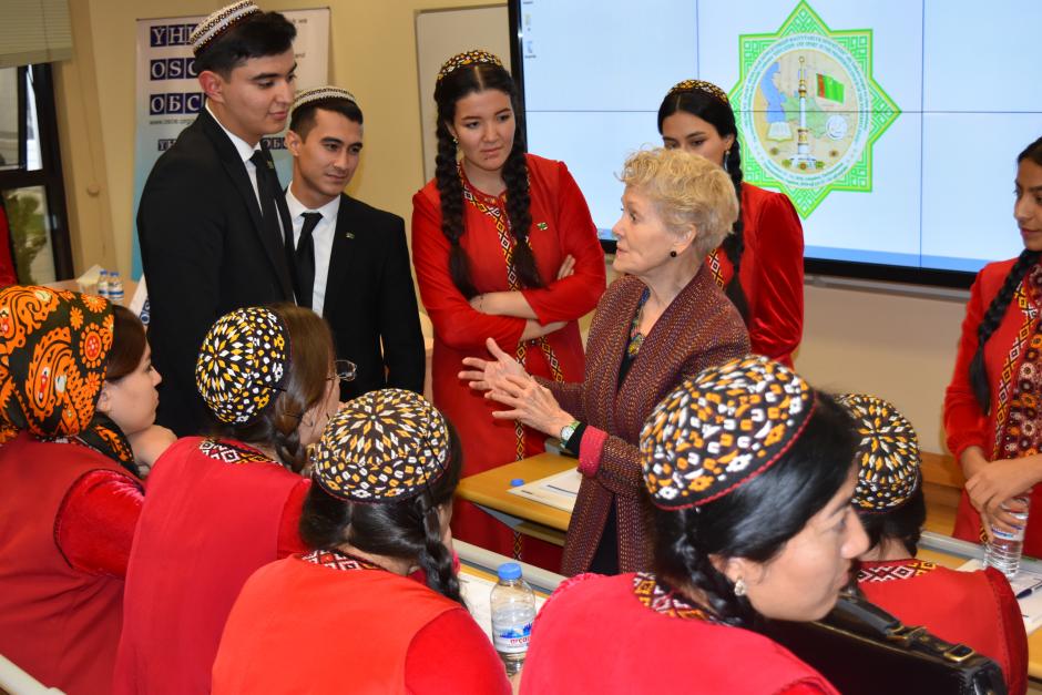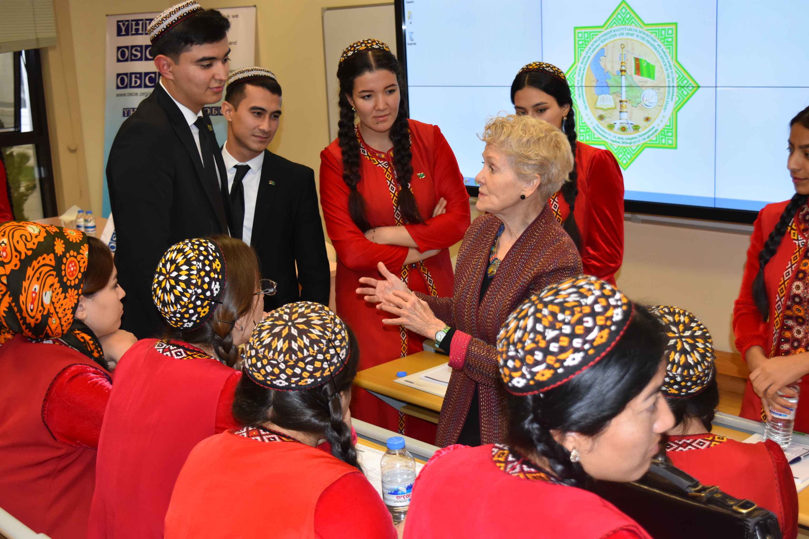 Swanee Hunt, the Eleanor Roosevelt Lecturer in Public Policy at the Harvard Kennedy School of Government in the United States, with students during the OSCE-organized lectures on the role of women in the security and development process, Ashgabat, 4 December 2018, OSCE