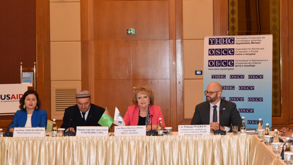 Natalya Drozd (c), Head of the OSCE Centre in Ashgabat, addresses participants at the OSCE- supported roundtable discussion on the development of renewable energy sector, Ashgabat, 25 April 2019.