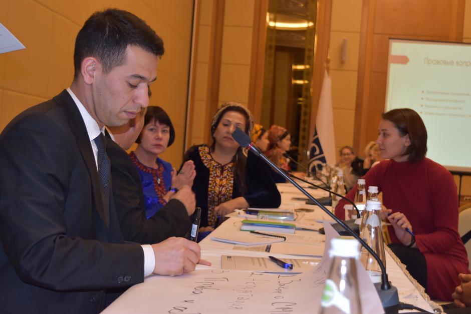Participants at the OSCE-organized seminar on modern approaches to journalism education during a practical exercise on the development of a module on freedom of expression, Ashgabat, 13 November 2019.