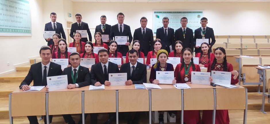 Teachers and students at the Magtymguly Turkmen State University with certificates after they complete an OSCE-organized course on human rights in the context of criminal justice, Ashgabat, 18 Novermber 2022