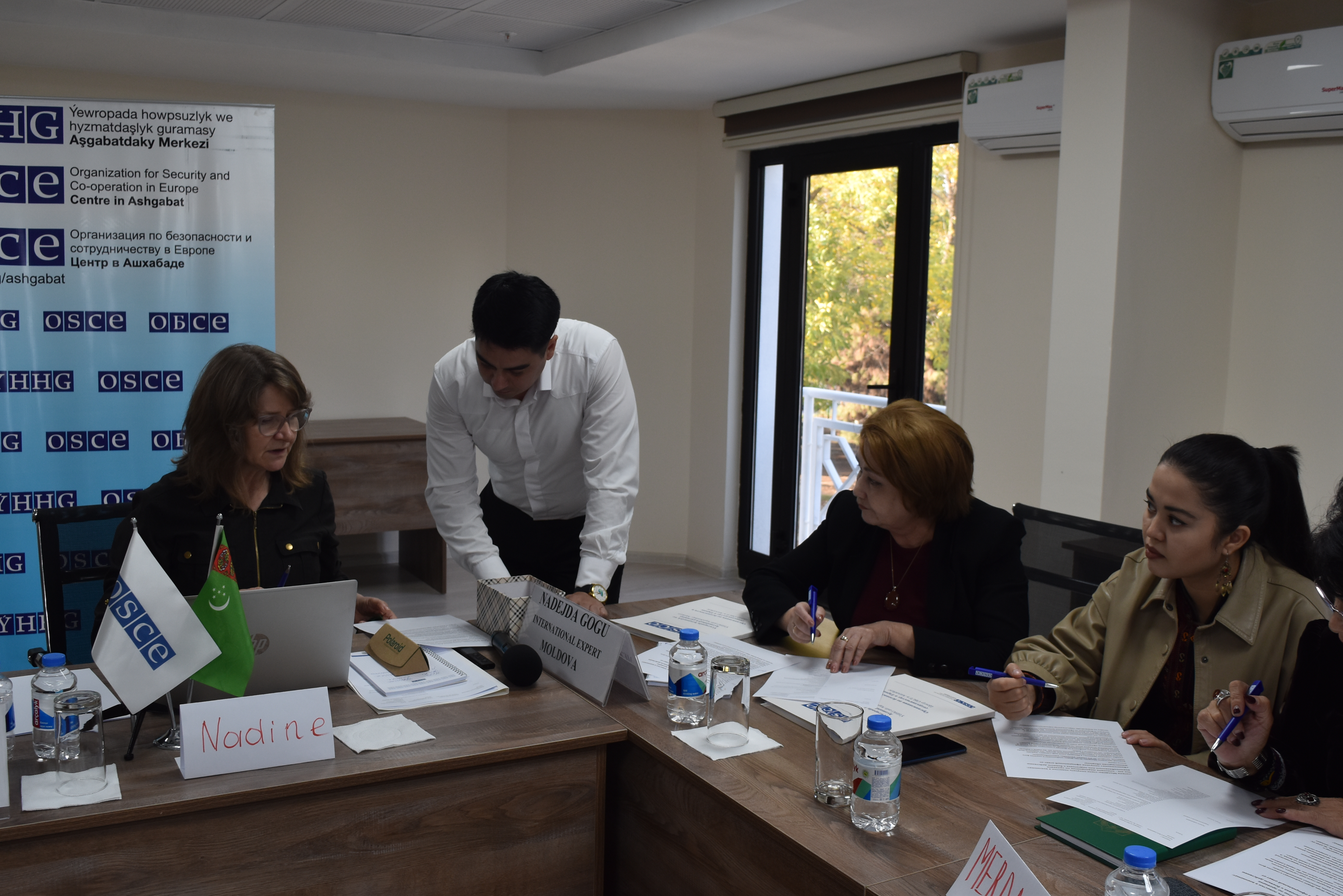 Expert Nadine Gogu from Moldova discusses a case with participants at an OSCE-organized course on media literacy, Ashgabat, 20 October 2023
