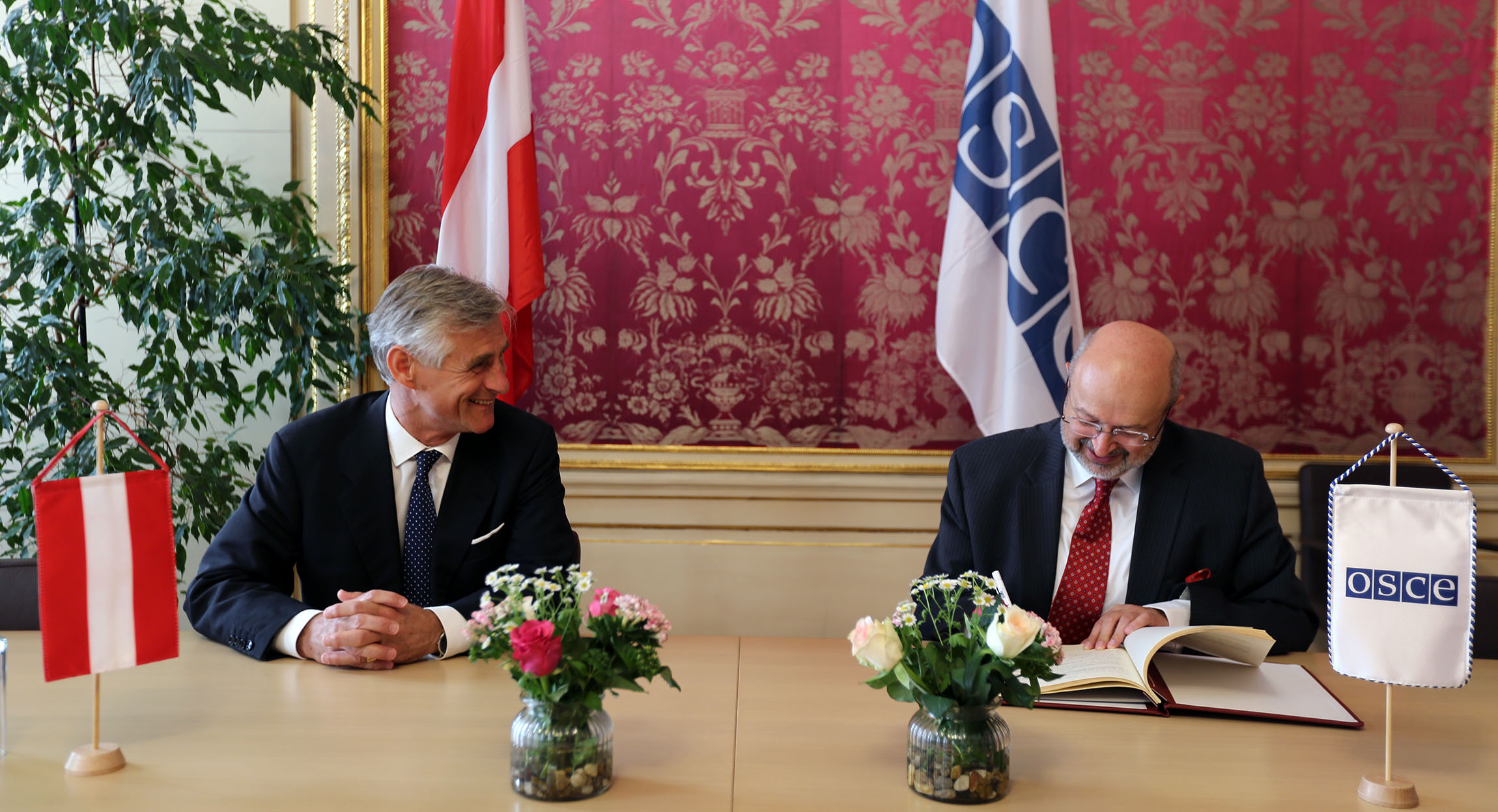 Austria’s Deputy Foreign Minister, Michael Linhart and OSCE Secretary General Lamberto Zannier (r) sign Headquarters Agreement regulating presence of OSCE in Austria, Vienna, 14 June 2017.