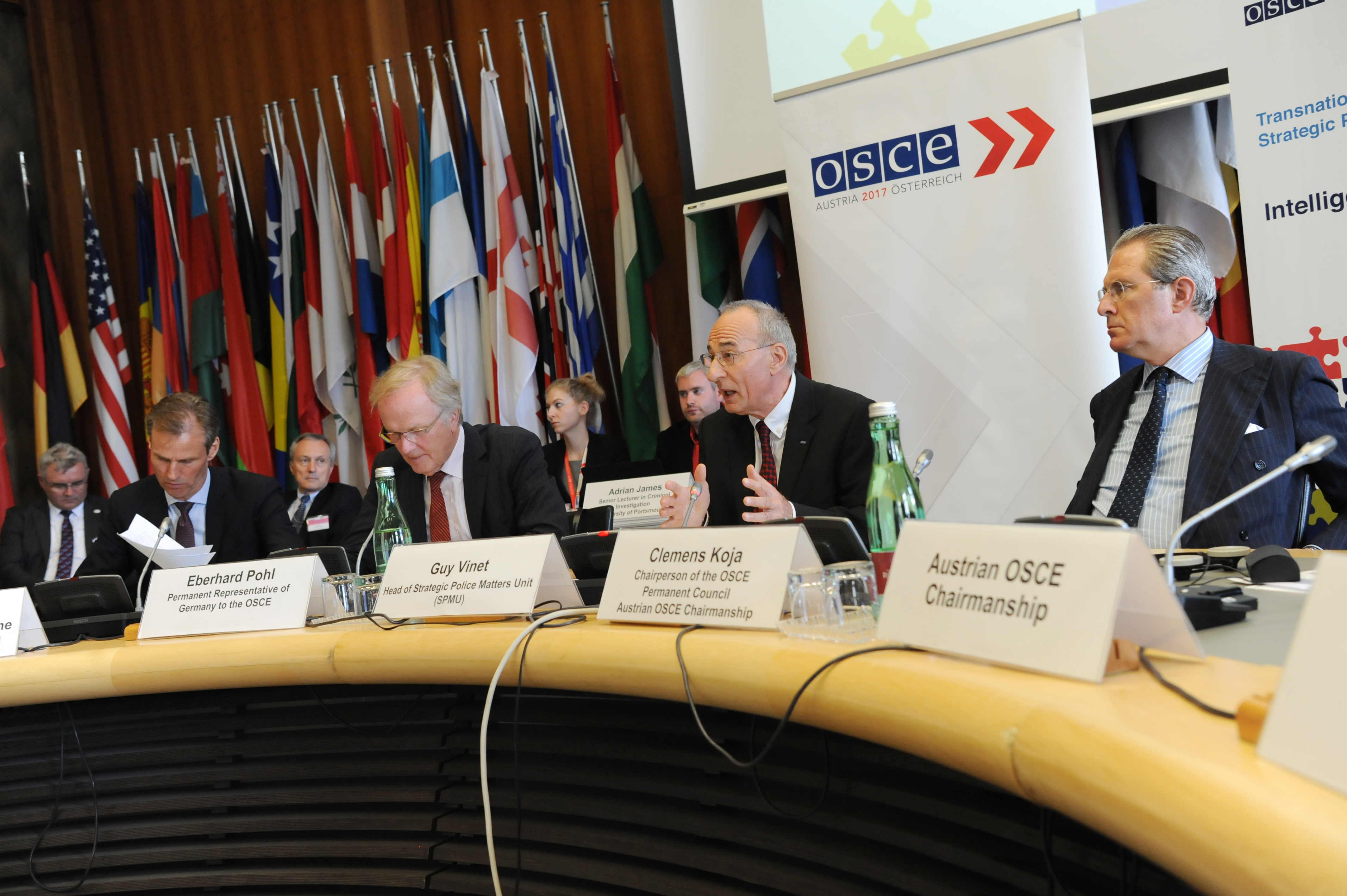 (L-r) Ambassador Paul Bekkers, Director of the Office of the OSCE Secretary General, Ambassador Eberhard Pohl, Permanent Representative of Germany to the OSCE, Guy Vinet, Head of the OSCE Strategic Police Matters Unit, and Ambassador Clemens Koja, Chairperson of the OSCE Permanent Council, representing the Austrian OSCE Chairmanship, open the event to present the OSCE Guidebook on Intelligence-Led Policing, Vienna, 3 July 2017.