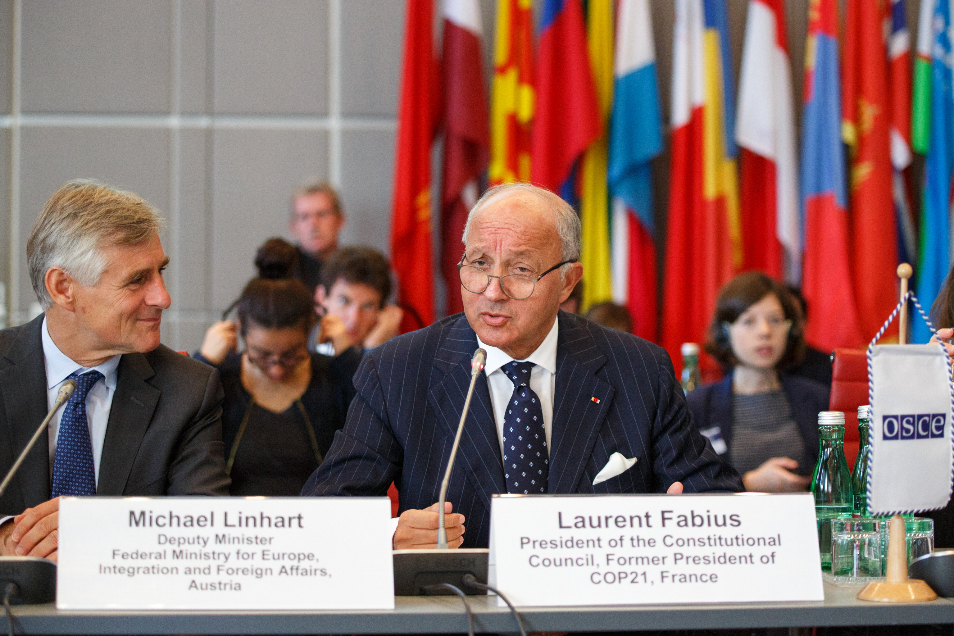 (l-r) Michael Linhart, Austrian Deputy Minister for Europe, Integration and Foreign Affairs. and Laurent Fabius, the French President of the Constitutional Council and former COP21 President at the Economic and Environmental Dimension Implementation Meeting, 16 October 2017.