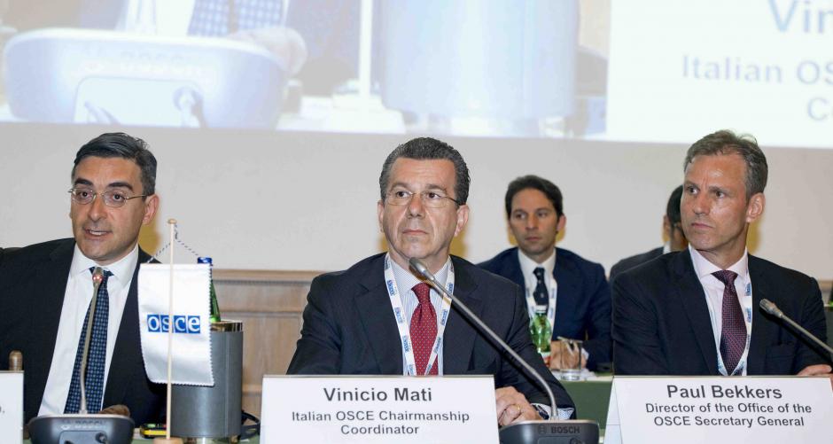 Vinicio Mati (c), Italian OSCE Chairmanship Co-ordinator and Paul Bekkers (r), Director of the Office of the OSCE Secretary General, open the 2018 OSCE-wide Counter-Terrorism Conference, Rome, 10 May 2018.