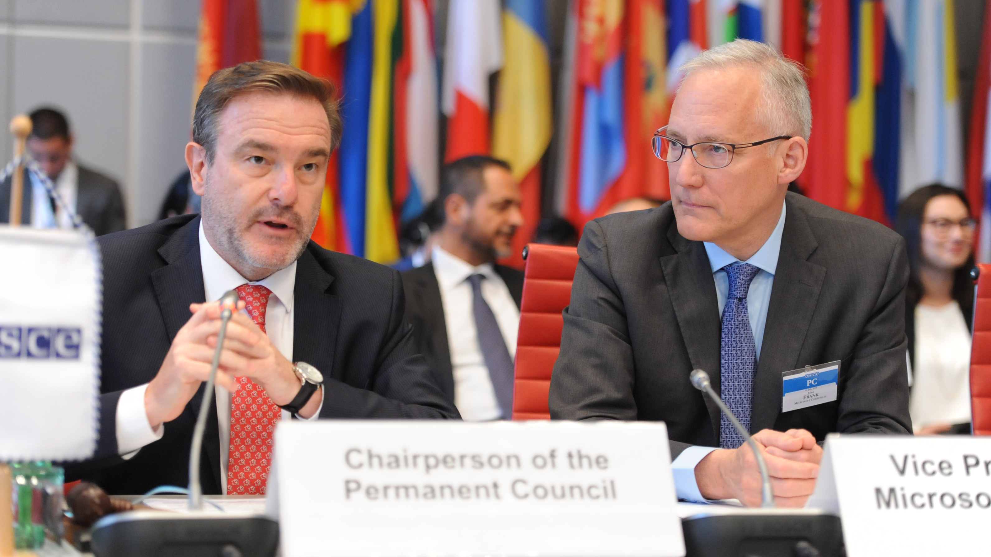 Ambassador Alessandro Azzoni (l), Permanent Representative of Italy to the OSCE and Chairperson of the OSCE Permanent Council, addresses the OSCE Permanent Council alongside John Edward Frank, Vice President of EU Government Affairs at Microsoft, Vienna, 12 July 2018.