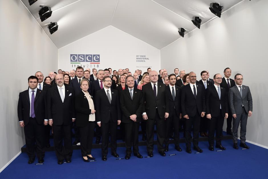 OSCE Foreign Ministers and Heads of Delegations pose for a family photo at the 25th Ministerial Council in Milan, 6 December 2018.