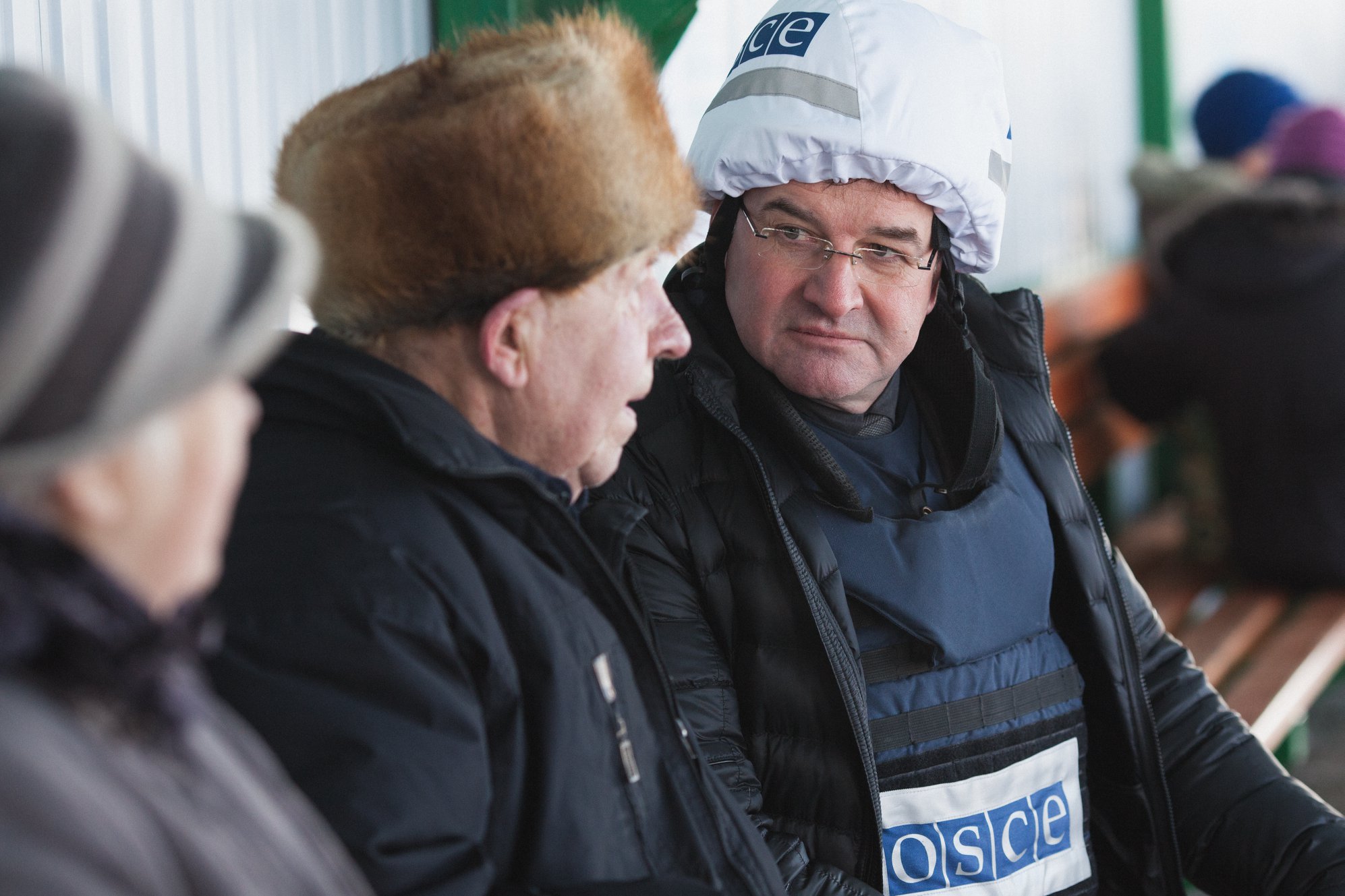 OSCE Chairperson-in-Office, Slovakia’s Foreign and European Affairs Minister Miroslav Lajčák (r) listens to the concerns of local people living near the entry-exit checkpoint in Stanytsia Luhanska,16 January 2019.