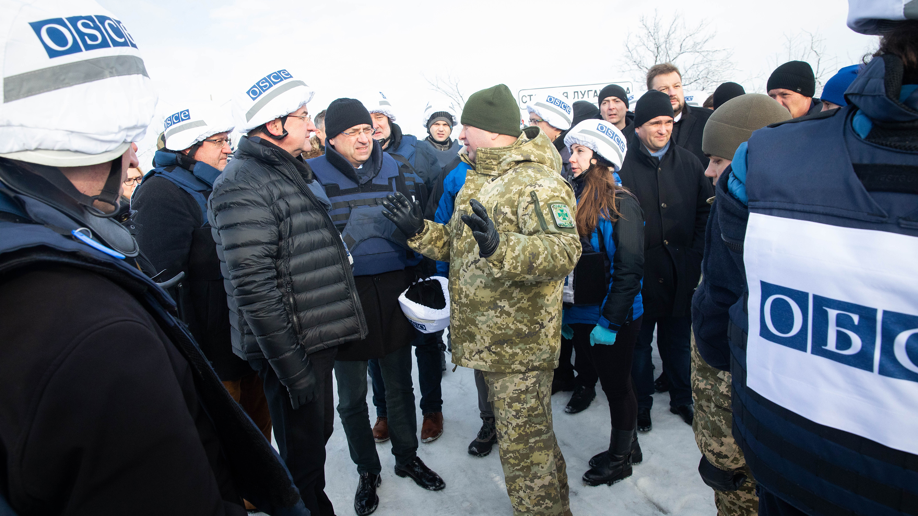 Miroslav Lajčák, OSCE Chairperson-in-Office and Minister of Foreign and European Affairs of Slovakia, receives briefing while visiting the entry-exit point on the Line of Contact at Stanica Luhanska, 16 January 2019.
