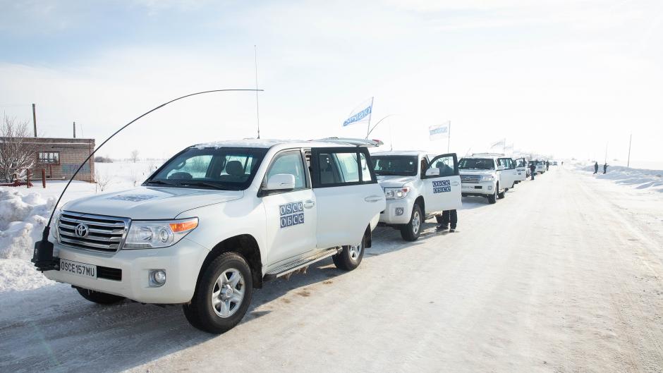 Patrol cars of the OSCE Special Monitoring Mission to Ukraine, Stanica Luhanska entry-exit point, 16 January 2019.