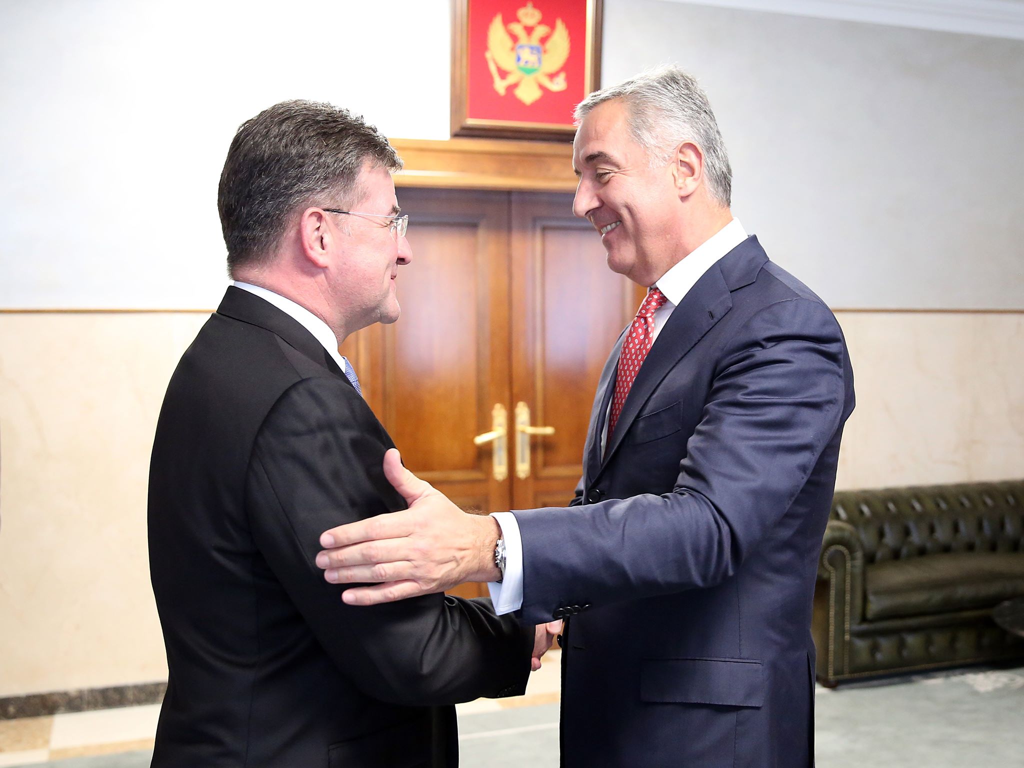 President of Montenegro, Milo Đukanović (r) greets the OSCE Chairperson-in-Office and Slovakia’s Foreign and European Affairs Minister Miroslav Lajčák, Podgorica, 8 May 2019.