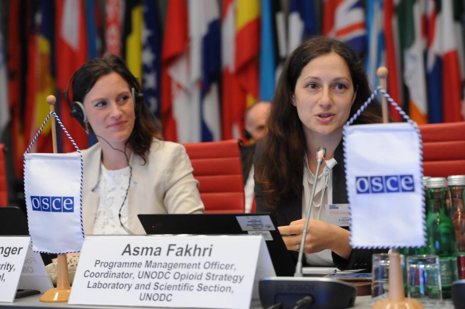 Anna-Katharina Deininger, Focal Point on Youth and Security in the Office of the OSCE Secretary General (l) and Asma Fakhri, Coordinator of the UNODC Opioid Strategy (r) address the 2019 OSCE-wide Conference on Combating the Threat of Illicit Drugs and the Diversion of Chemical Precursors, Vienna, 4 June 2019.