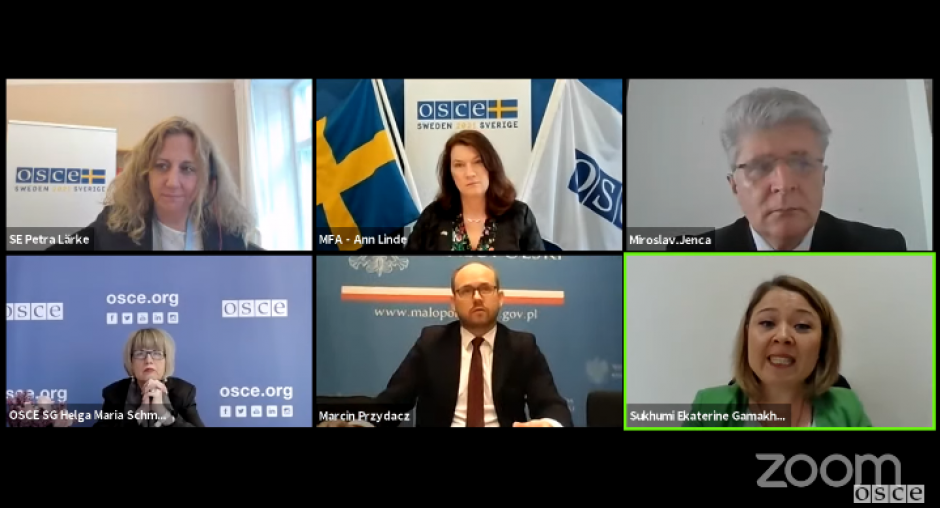 In the opening session, OSCE Chairperson-in-Office, Swedish Foreign Minister Ann Linde, Deputy Minister Marcin Przydacz from the incoming Polish chairpersonship, OSCE Secretary General Helga Maria Schmid, Ms. Ekaterine Gamakharia, from the Cultural Humanitarian Fund “Sukhumi” and UN Assistant Secretary-General for Europe, Central Asia and the Americas, Mr. Miroslav Jenča, underlined the need to work jointly to identify how to best employ and strengthen the existing toolbox. The importance of implementing the women, peace and security agenda was addressed by all.