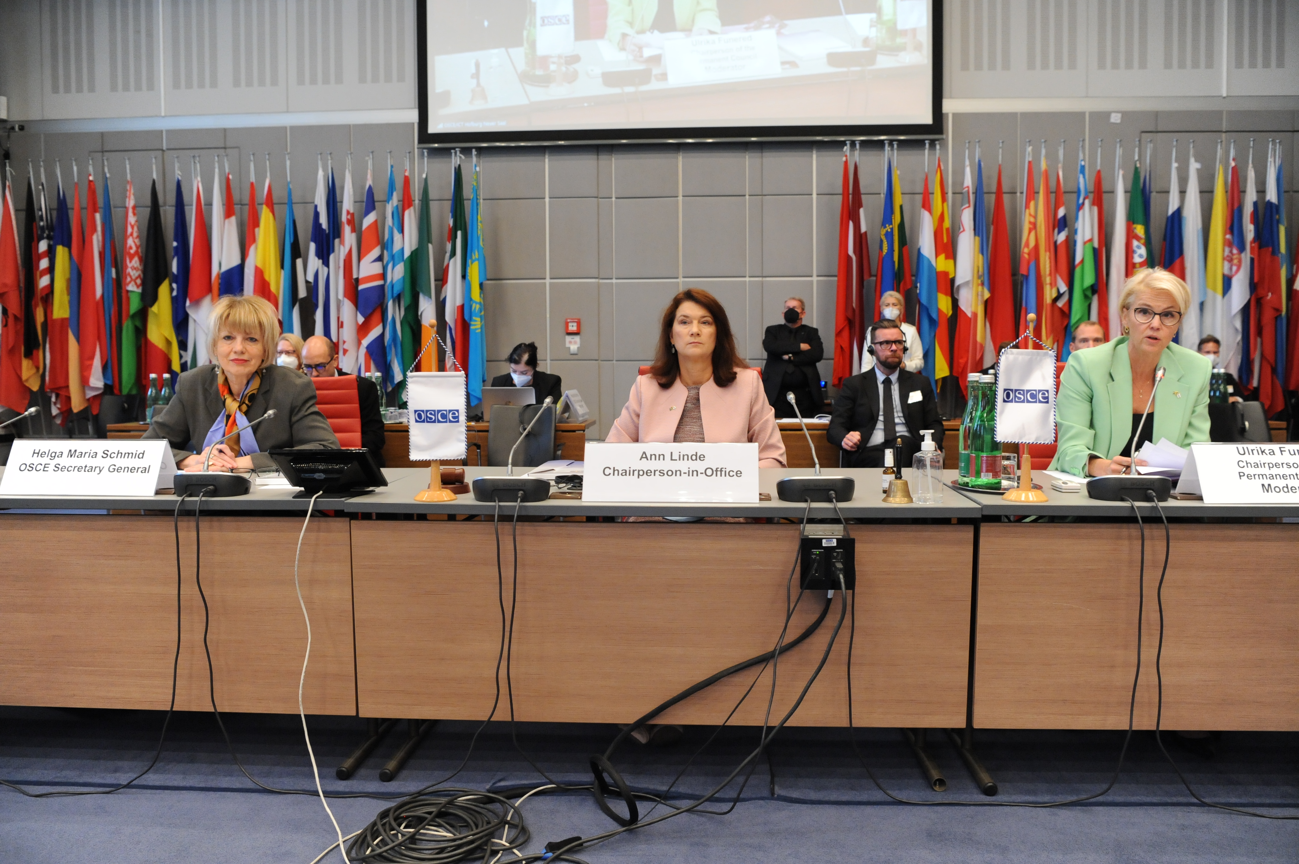 OSCE Secretary General Helga Maria Schmid; Ann Linde, OSCE Chairperson-in-Office and Swedish Minister for Foreign Affairs; Ulrika Funered, Permanent Representative of Sweden to the OSCE, opening the 2021 OSCE Annual Security Review Conference, 31 August 2021.