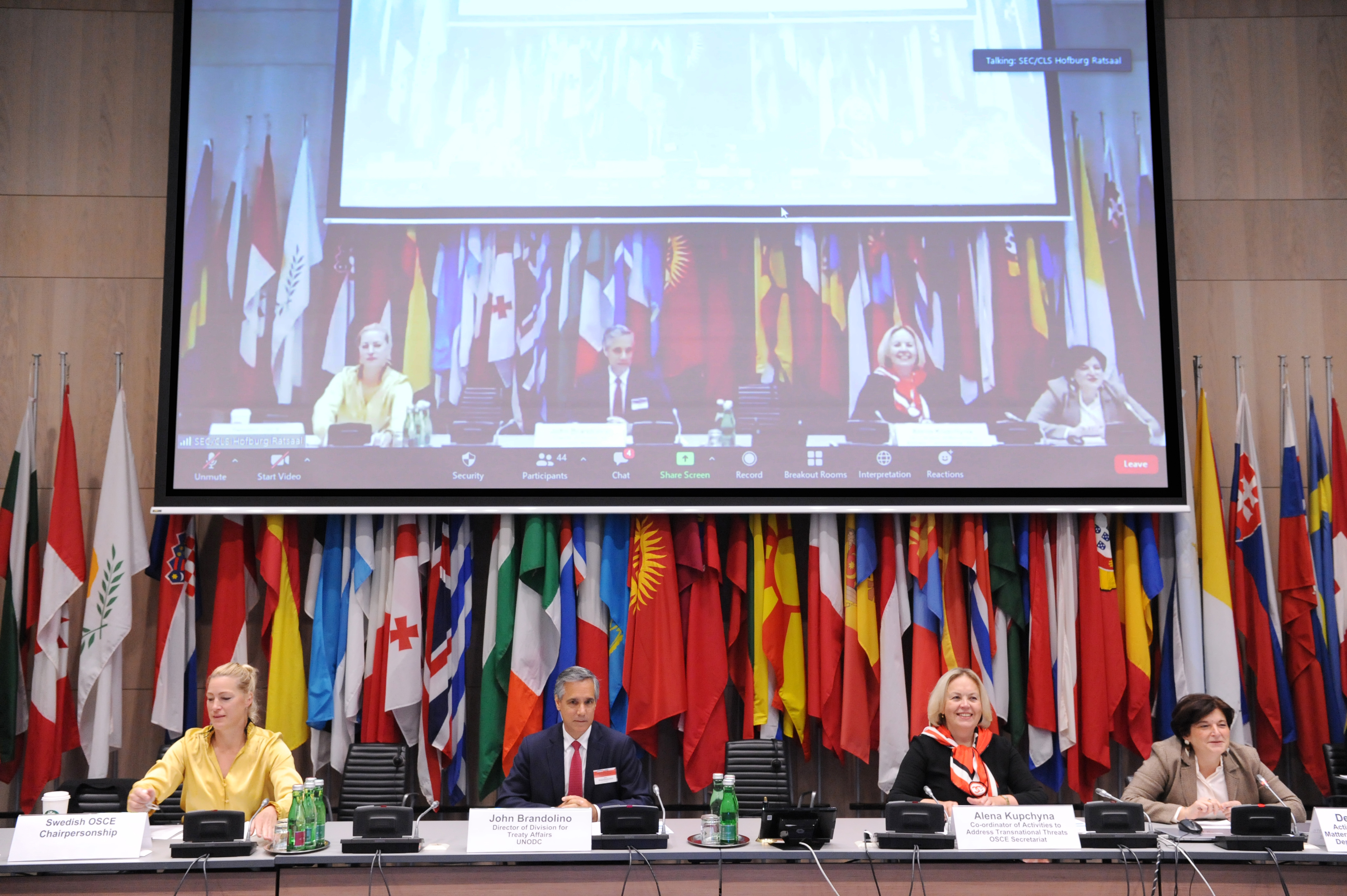 (L-r) Maria Gratschew, Counsellor, Permanent Delegation of Sweden to the OSCE; John Brandolino, Director of the Division for Treaty Affairs at the United Nations Office on Drugs and Crime (UNODC); Alena Kupchyna, OSCE Co-ordinator of Activities to Address Transnational Threats; Denise Mazzolani, Head of the OSCE Strategic Police Matters Unit at the opening session of the 2021 OSCE Annual Police Experts Meeting, 7 October 2021, Vienna