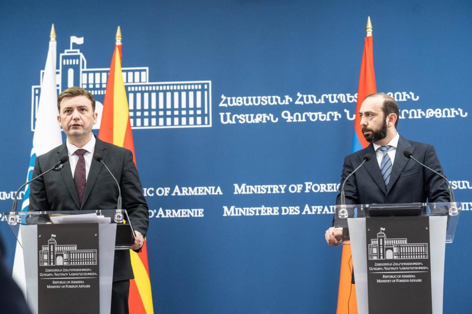 OSCE Chairman-in-Office Bujar Osmani speaking at the press conference with Minister of Foreign Affairs of Armenia, Ararat Mirzoyan, Yerevan, 13 April 2023.