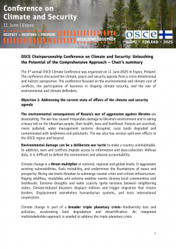 The Chair's summary following the 3rd annual OSCE Chairpersonship Climate Conference, which was organized on 11 June in Espoo, Finland. The conference discussed climate, peace and security agenda from cross-dimensional and holistic perspective. The conference focused on the environmental and climate cost of conflicts, the participation of business in shaping climate security, and the role of environmental and climate defenders.