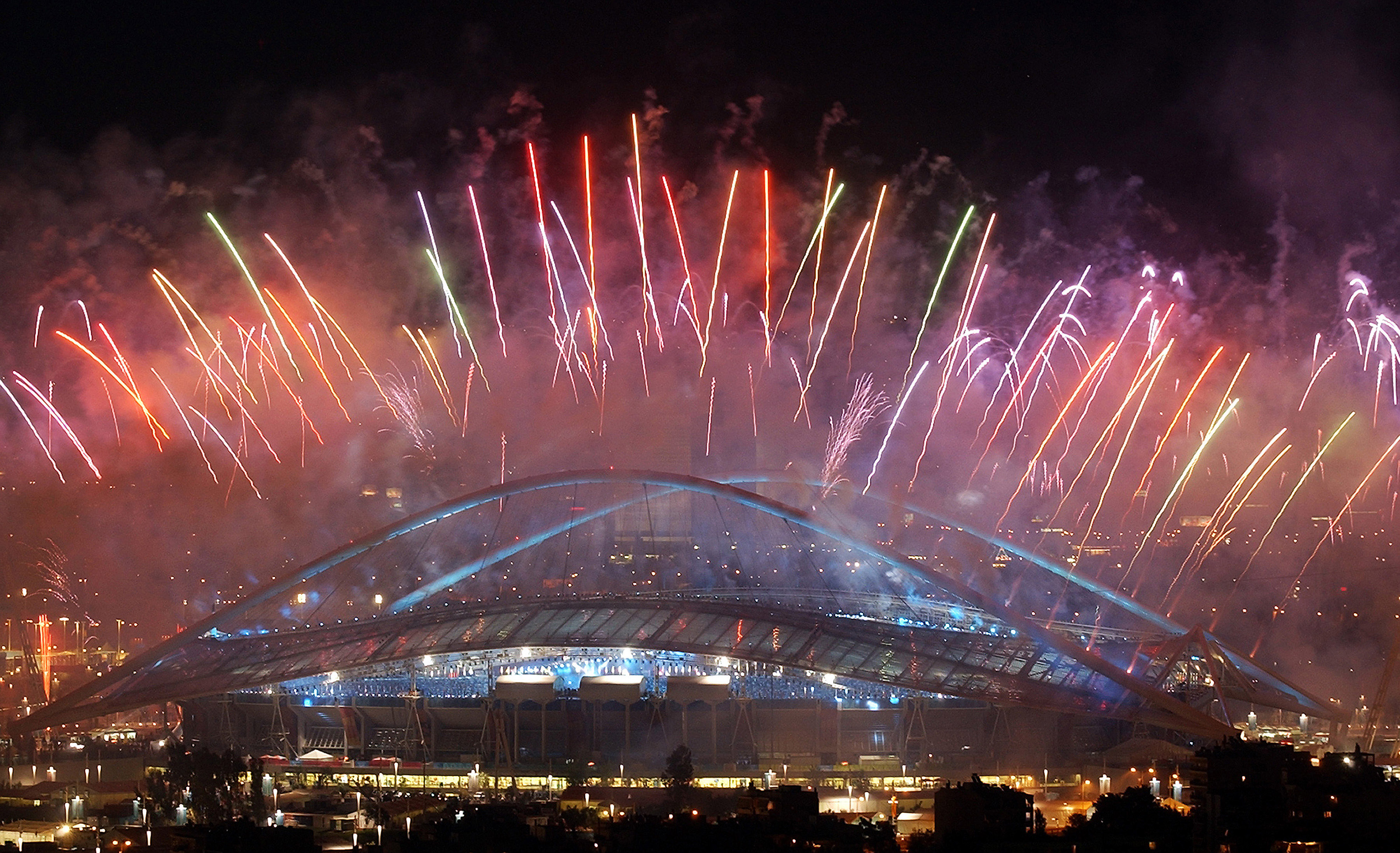 Fireworks over the Olympic stadium in Athens.
