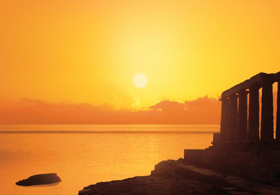 The sun sets at Cape Sounion on the Attica peninsula in Greece, the site of the ruins of the ancient Greek temple of Poseidon.