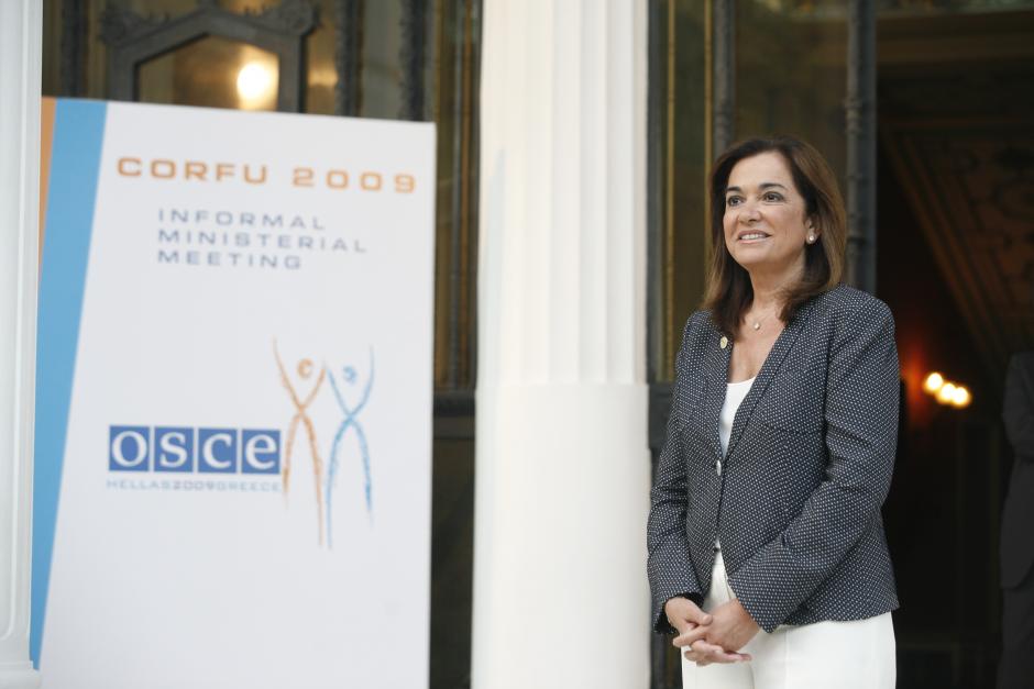 OSCE Chairperson-in-Office and Greek Foreign Minister Dora Bakoyannis waits to greet the foreign ministers as they arrive at the Achillion Palace in Corfu, 27 June 2009.