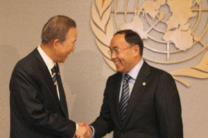 The OSCE Chairperson-in-Office, Kazakhstan's Secretary of State and Foreign Minister Kanat Saudabayev (right), meets UN Secretary-General Ban Ki-Moon following an address to the UN Security Council, New York, 5 February 2010.