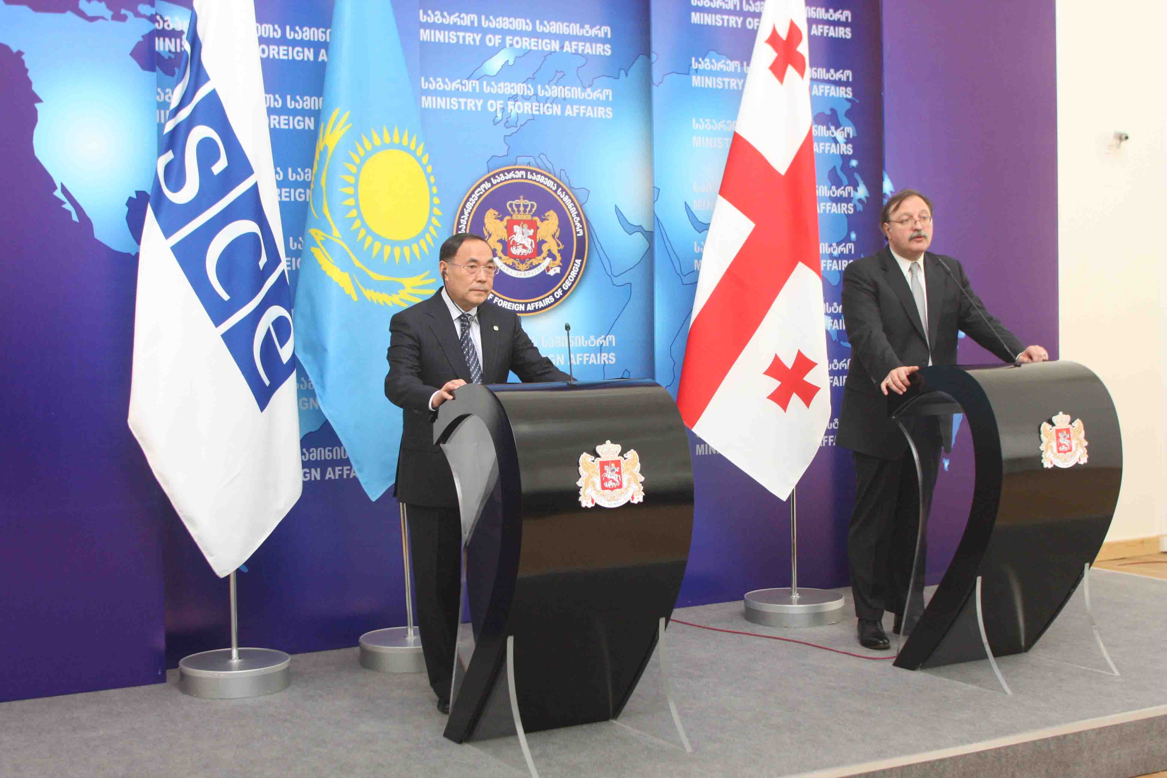 The OSCE Chairperson-in-Office, Kazakhstan's Secretary of State and Foreign Minister, Kanat Saudabayev (l), and Georgia's Foreign Minister Gregory Vashadze speak to the media after meeting in Tbilisi, 17 February 2010.