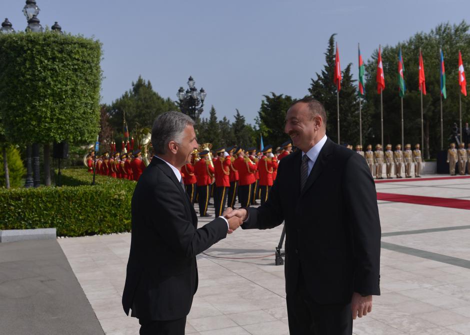 The OSCE Chairperson-in-Office and Swiss Foreign Minister Didier Burkhalter, on an official visit to the South Caucasus, shaking hands with Azerbaijan's President llham Aliyev, Baku, 2 June 2014.