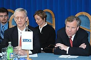 The OSCE Chairman-in-Office, Jaap de Hoop Scheffer (right), and Ambassador William Hill, Head of the OSCE Mission to Moldova, Chisinau, 3 April 2003.
