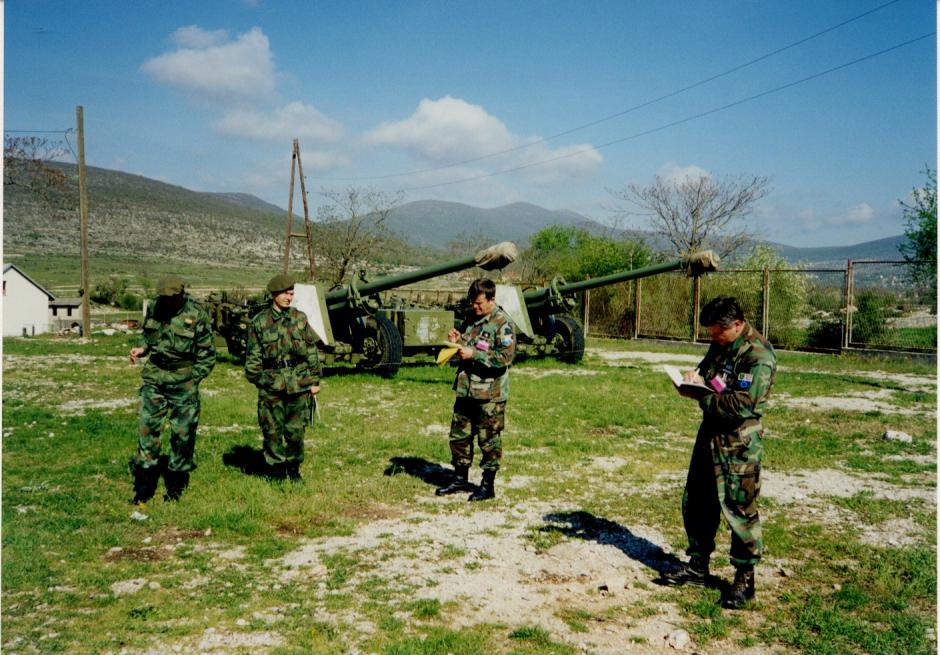 An Inspection Team from Bosnia and Herzegovina inspect the 16th Artillery Brigade in Bjelovar, Croatia in May 2001. Field Guns T 130mm M-46 are visible in the background.