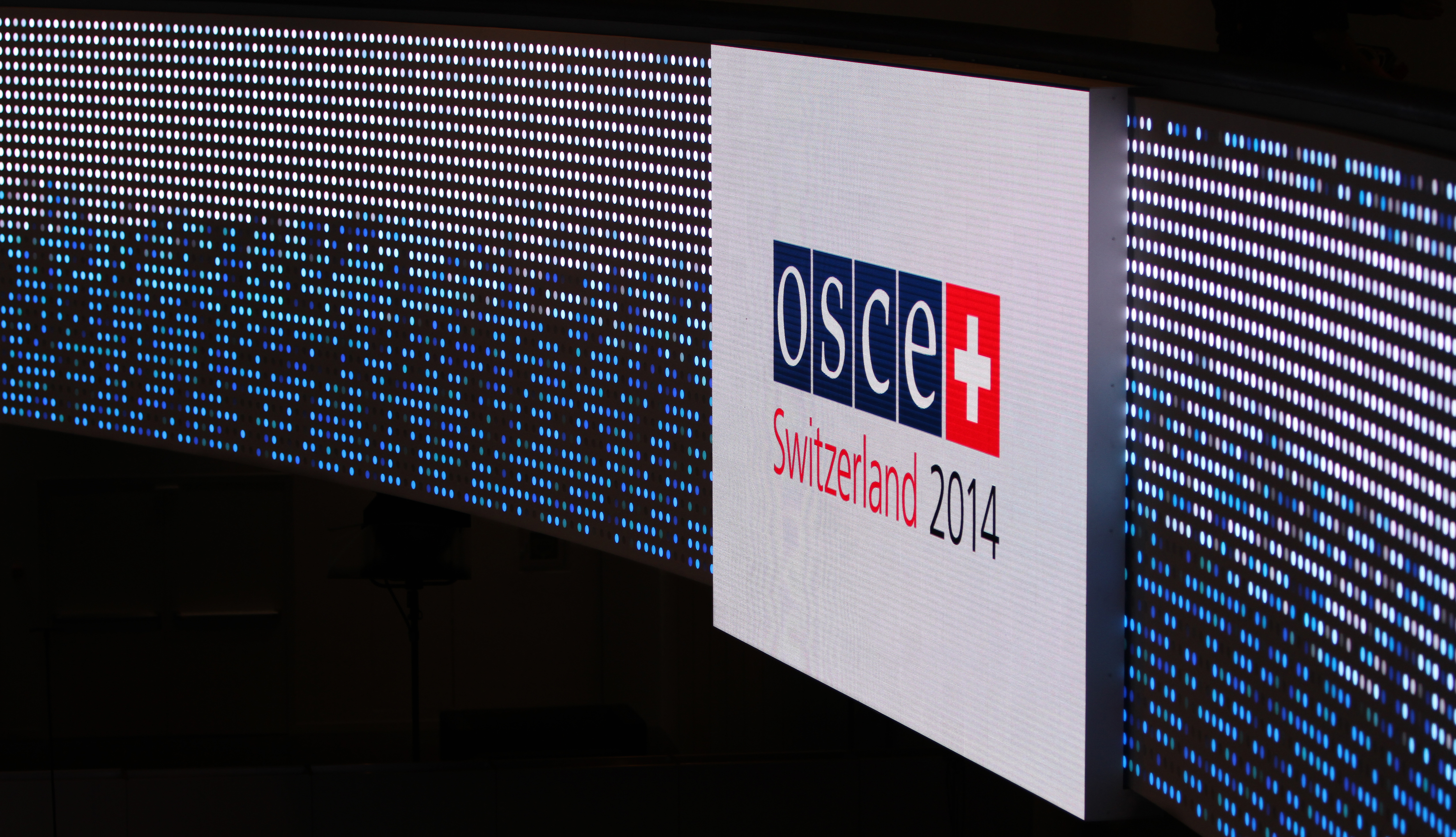 A sign welcoming participants to the 21st OSCE Ministerial Council in Basel, 2 December 2014.