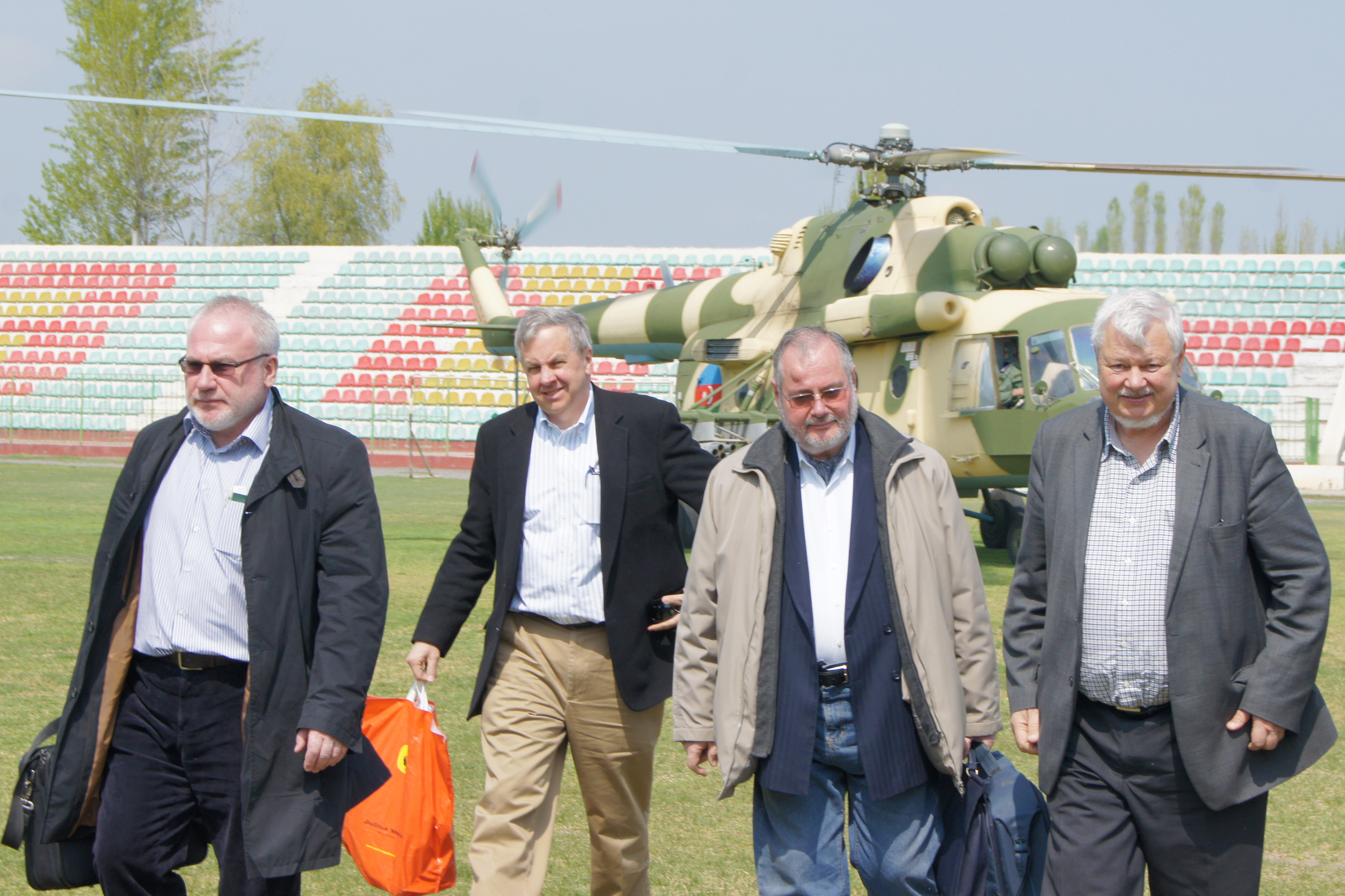 Ambassador Andrzej Kasprzyk, the Personal Representative of the Chairperson-in-Office on the conflict dealt with by the OSCE Minsk Conference, and the co-chairs disembarking from a helicopter, Azerbaijan, 4 April 2013.
