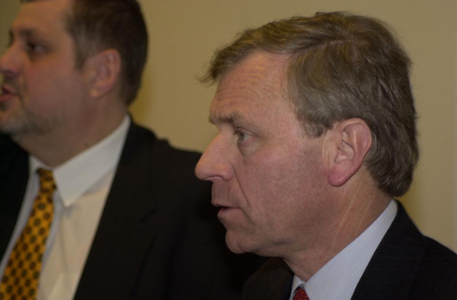 The OSCE's Chairman-in-Office in 2003, Netherlands Foreign Minister Jaap de Hoop Scheffer (right), addressing the Permanent Council in Vienna, 13 January.