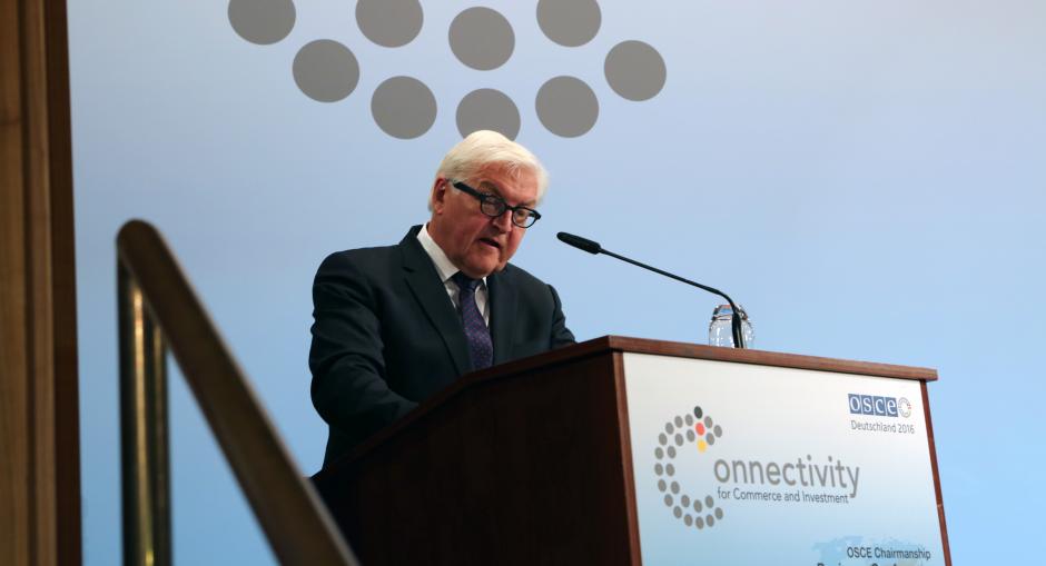 OSCE Chairperson-in-Office and German Foreign Minister Frank-Walter Steinmeier during an opening session of the Connectivity for Commerce and Investment conference, Berlin, 18 May 2016.