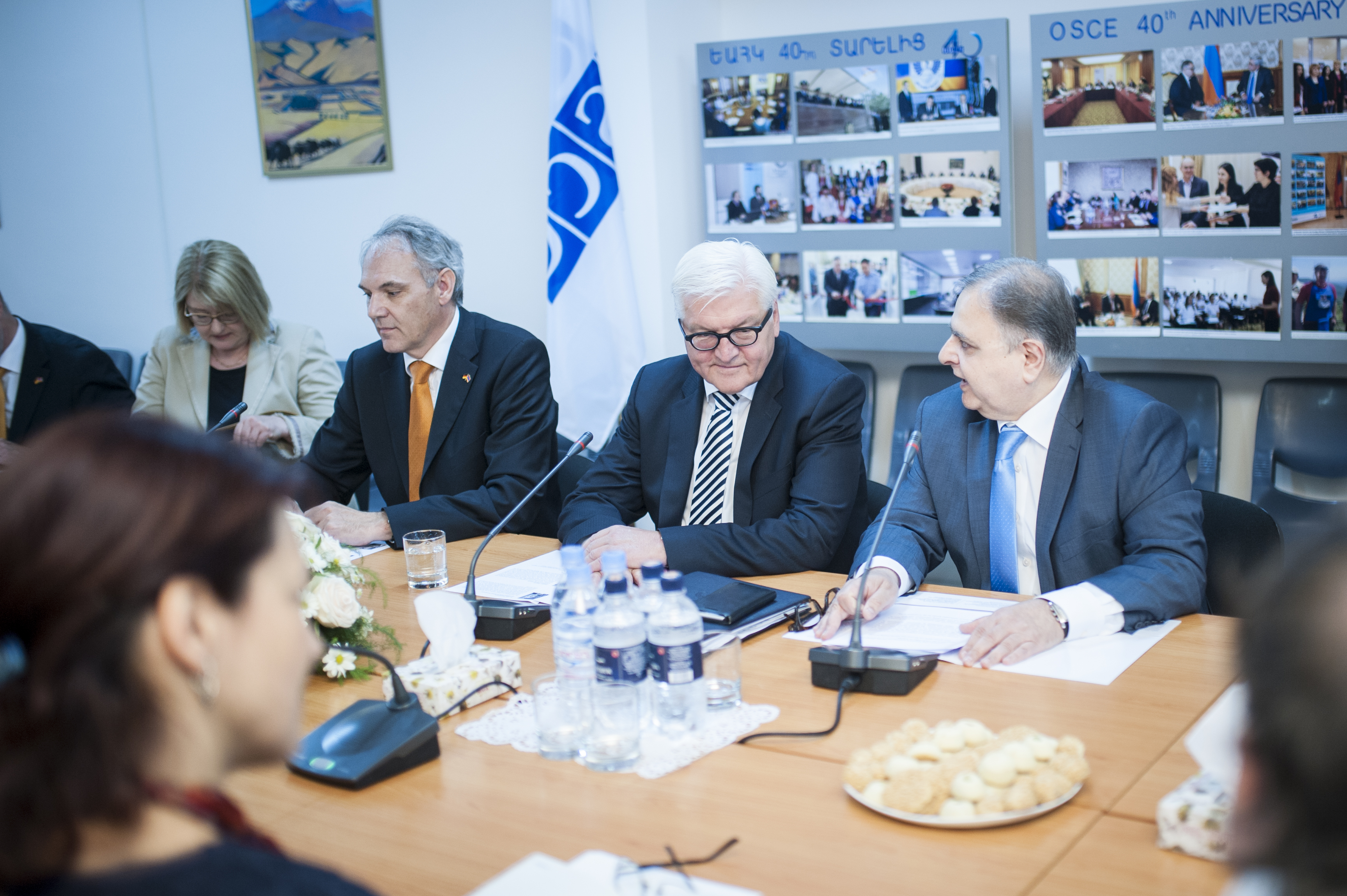 OSCE Chairperson-in-Office, German Foreign Minister Frank-Walter Steinmeier (centre) visiting the OSCE Office in Yerevan, alongside the Head of the Office Ambassador Argo Avakov (centre-right), 30 June 2016.