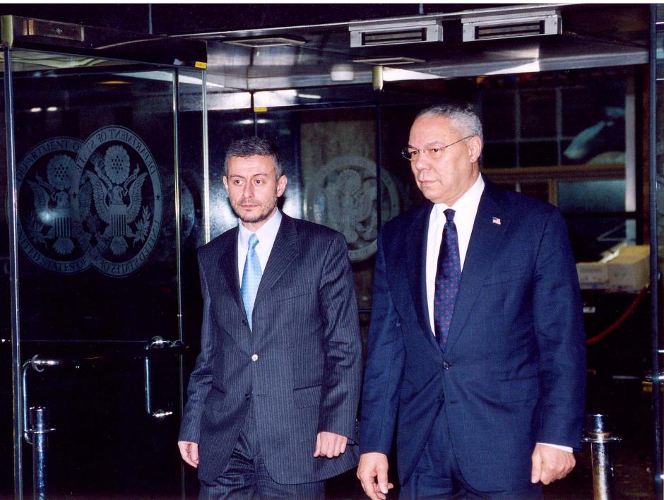 OSCE Chairman-in-Office, Bulgarian Foreign Minister Solomon Passy (left), walks out with U.S. Secretary of State Colin Powell, after talks in Washington D.C., 27 February 2004.