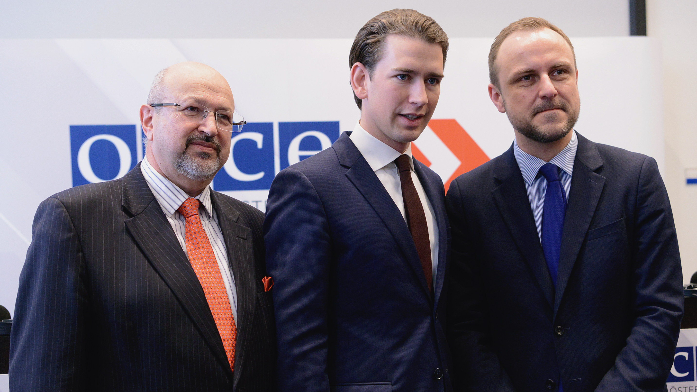 OSCE Secretary General Lamberto Zannier (l-r), OSCE Chairperson-in-Office, Austrian Foreign Minister for Europe, Sebastian Kurz and OSCE Special Representative on Countering Radicalization and Violent Extremism, Peter Neumann, at a press conference after the Permanent Council Meeting, Vienna, 12 January 2017.