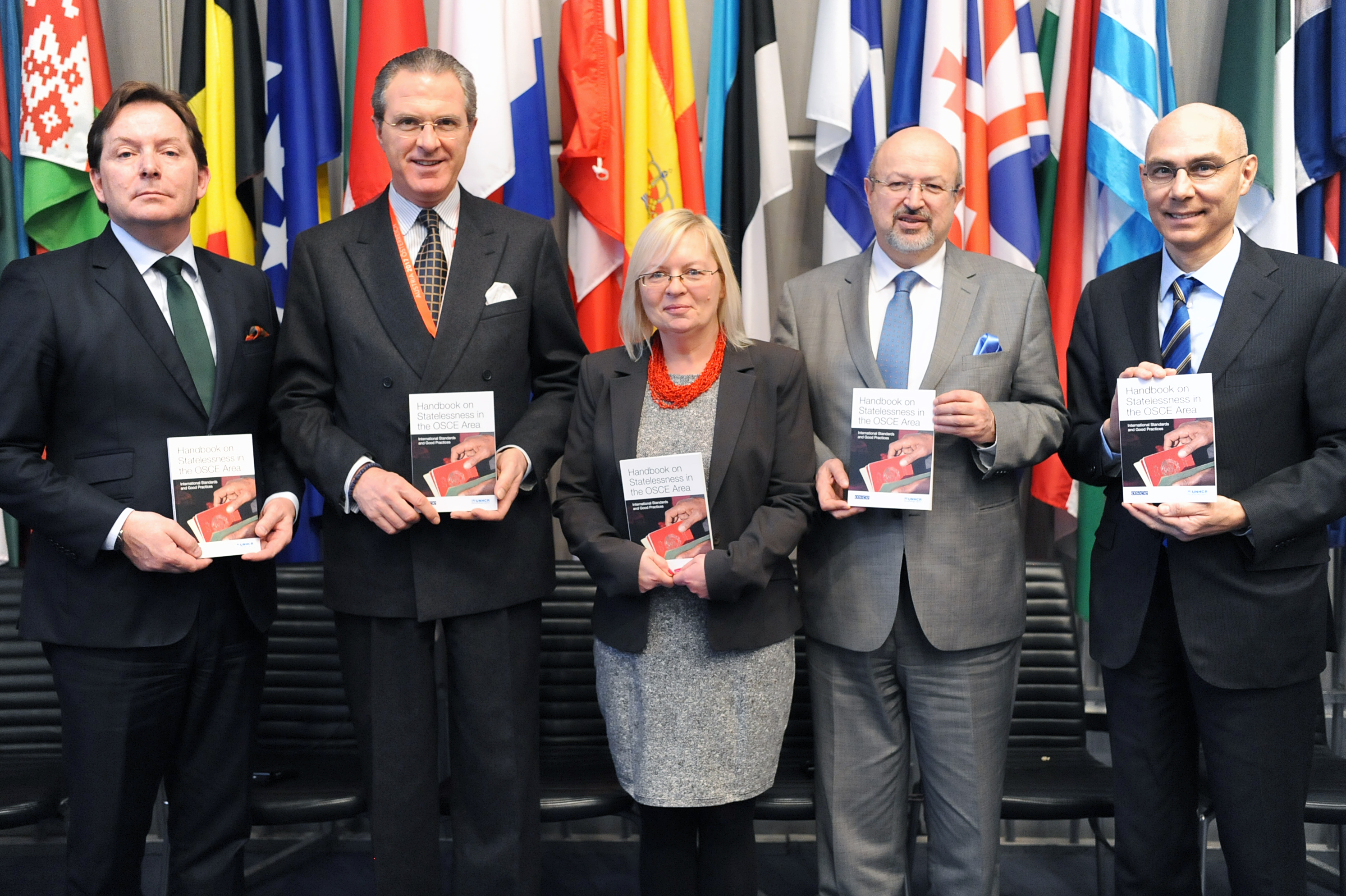 (L-r) Henrik Villadsen, Director and Officer-in-Charge at the OSCE High Commissioner on National Minorities; Clemens Koja, Chairperson of the OSCE Permanent Council; Katarzyna Jarosiewicz-Wargan, First Deputy Director at the OSCE Office of Democratic Institutions and Human Rights; Lamberto Zannier, OSCE Secretary General; and Volker Türk, Assistant High Commissioner for Protection at the United Nations High Commissioner for Refugees (UNHCR), present a new OSCE-UNHCR handbook of international standards and good practices to address statelessness in the OSCE area, Vienna, 2 March 2017.